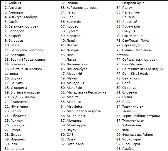 10.10.2013Цей список підготовлений КМУ для виконання норм Податкового кодексу України в частині трансфертного ціноутворення. А саме, одним із видів контрольованих операцій, є операції резидентів з нерезидентами з низькоподаткових юрисдикцій. У категорію низькоподаткових потрапляють ті юрисдикції, в яких корпоративний податок не сплачується або сплачується за ставками, відмінним від податку на прибуток в Україні на 5 відсотків.