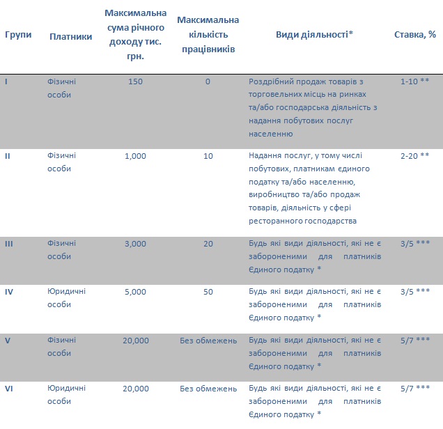 *** 3% (або 5% для груп V і VI) застосовується, якщо ПДВ сплачується в загальному порядку; 5% (або 7% для груп V і VI) у разі, якщо ПДВ включений до складу єдиного податку.