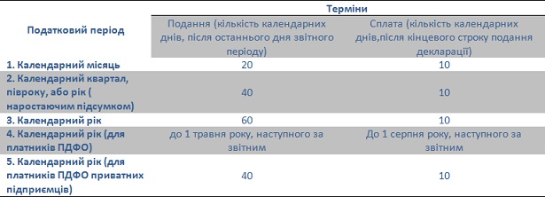 Кінцеві строки подання декларацій та сплати податків відповідно до Податкового кодексу зазначені в таблиці нижче: